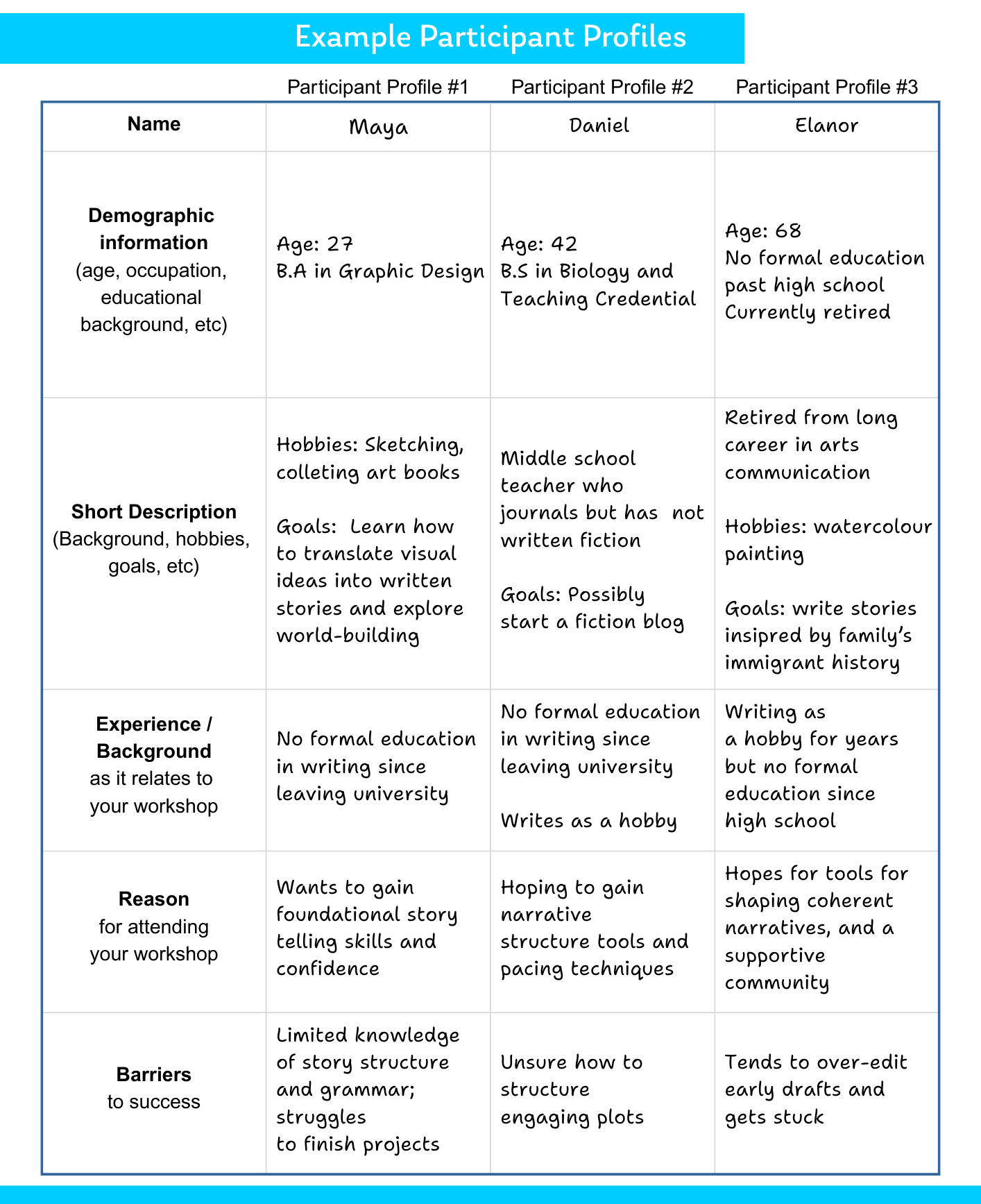 | Short Description (Background, hobbies, goals, etc) | Hobbies: Sketching, colleting art books Goals: Learn how to translate visual ideas into written stories and explore world-building | Middle school teacher who journals but has not written fiction Goals: Possibly start a fiction blog | Retired from long career in arts communication Hobbies: watercolour painting Goals: write stories insipred by family’s immigrant history |